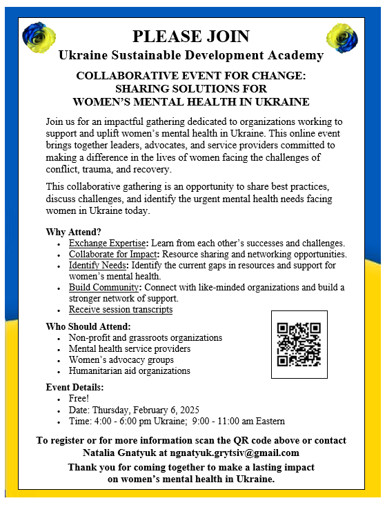 In 2024, as a Delegate to the United Nations for the Commission on the Status of Women, I attended an online session hosted by the Ukraine Sustainable Development Academy. I was deeply moved by their work addressing women’s mental health during the ongoing war in Ukraine. I learned that many children were dropping out of school, convinced they had no future; women and men were battling depression; and marriages were under severe strain. It became clear to me that if we could help strengthen women’s mental health, they would be in a stronger position not only to help themselves, but also to support their children, families, and communities.